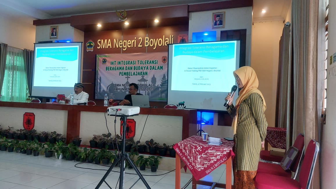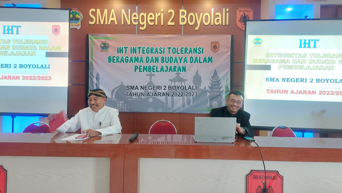 IHT Integrasi Toleransi beragama dan budaya dalam pembelajaran dengan narasumber Pengawas SMA Bapak Maryanto, S.Pd. M.Pd yang dilaksanakan pada tanggal 9 Februari 2023 di Aula SMAN 2 Boyolali diikuti oleh seluruh Bapak/Ibu Guru berjalan dengan baik.
